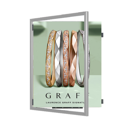 This 1 3/4" wide security quick changing, wall-mount aluminum snap open frame, with its mitered corners, makes a good frame choice for small and large scale advertising poster and signage projects that have limited budgets and where tampering may be a concern. Choose from 35 standard and custom poster frame sizes. Custom Snap Frame sizes are also available, including large format poster frames. Quick Change Security Poster Snaps come in three popular metal frame finishes; Satin Black, Satin Silver and Satin Gold.