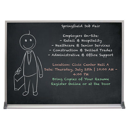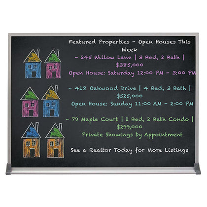 This value line Black Chalk Board has an attractive 1/2" wide satin aluminum trim border frame. The Open Face Chalk Board is a great way to brainstorm, post messages, or create advertisements. Easy and adaptable, these Chalk Boards make it simple to update and add to your school lessons, restaurant menus, business / at home notes, or advertisements.