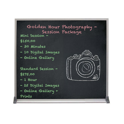 This value line Black Chalk Board has an attractive 1/2" wide satin aluminum trim border frame. The Open Face Chalk Board is a great way to brainstorm, post messages, or create advertisements. Easy and adaptable, these Chalk Boards make it simple to update and add to your school lessons, restaurant menus, business / at home notes, or advertisements.