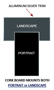 Vinyl covered corkboards with silver metal frame tim can hang Vertical (Portrait) or Horizontal (Landscape). Wall Mounting hardware brackets are included with your open face cork board order.