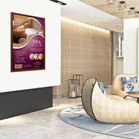 Wood Poster Snap Frames are the ideal choice for many quick change display applications that require an interior touch with a wood finish. Whether it's a small wood snap frame project or large national signage rollout, no other changeable poster frame or sign frame meets the display needs and tight budgets as cost effectively as easy front loading, wall mount wood faux snap frames. Don't see the Wood Poster Snap Frame Size you need? Call. We'll built it.